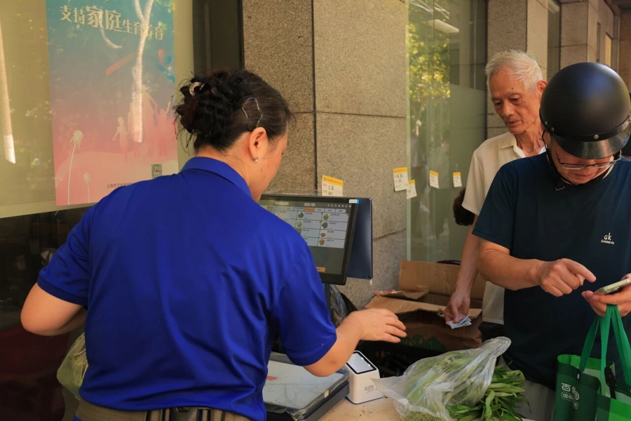 9月26日8时许,杨浦小世界的外广场上就排起了长队。青菜、番茄、花菜等多种新鲜蔬菜整齐摆放,众多居民前来选购。“这个空心菜和黄瓜都只要1.5元/斤,又新鲜又便宜,比菜市场便宜一半多,在家门口就能买到,真是太方便了!”居民胡阿姨高兴地说。不仅价格实惠,现场还贴心地设置了专收现金的摊位,方便习惯使用现金的老年人采购。