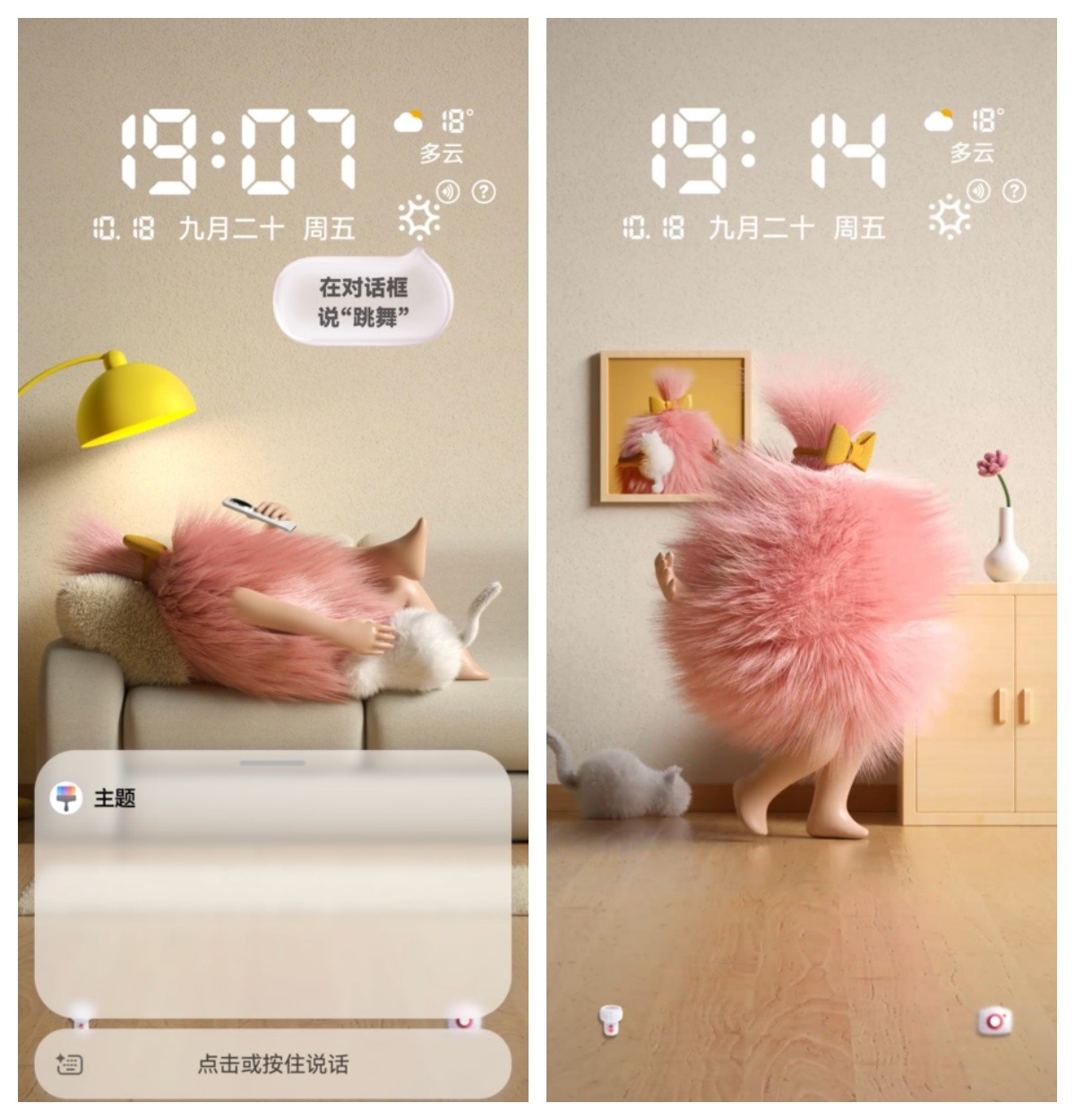 以前我觉得锁屏只是一个看时间的界面,但升级HarmonyOS 6后,我体验了像“精致毛球的一天”这样的AI语音互动主题,像是在锁屏上养了只“电子哈基米”。试想一下,当你工作累了,看着手机锁屏,只需说出口令就能触发超多有趣的动画彩蛋。从清晨起床洗漱到上班工作,都有你的专属“赛博搭子”陪伴。这种即时的反馈感,让每一次点亮屏幕,都是一次有趣互动。