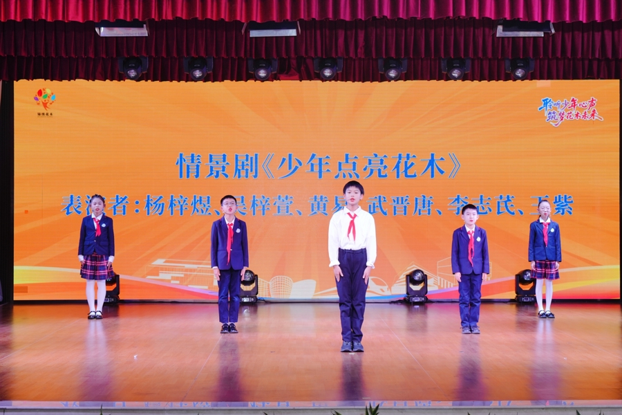 此次成果展示活动现场化作疾驰的“花木未来号”列车,与会学生和嘉宾作为“乘客”,依次途经“知行广场站”“星光荣耀站”等主题站点,在沉浸式体验中触摸花木少年的成长轨迹。情景剧《少年点亮花木》生动再现了少年们化作“娃娃林长”“花木邻聚场”主理人等参与社区治理的实践故事;“锦绣花木”小记者团带来的《花木如诗,宜居成歌》TED分享,勾勒出未成年人视角下宜居花木的温暖细节;进才实验中学合唱团的一曲《感谢》,既表达了对各方关爱的感恩之情,也传递出他们立志成才、回报社会的坚定决心。