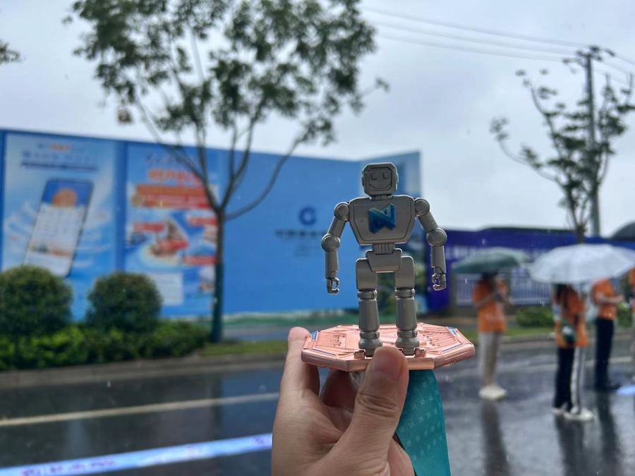 启动仪式后,作为艺术季“开门红”的“智慧乐跑”活动同步开启。数百名跑者从象征未来的“科创之门”出发,沿着连亮路一路奔向上海师范大学附属中学宝山分校。这场全程2.6公里的乐跑,最亮眼的风景莫过于宇树科技的人形机器人G1与机器狗Go2组成的“硅基陪跑天团”。它们不仅在一旁灵活地为跑者加油助威,更在终点处成了最受欢迎的合影伙伴。跑者们手持设计前卫的科技感奖牌,争相与这两位特殊的“运动员”同框,记录下这充满奇趣的一刻。