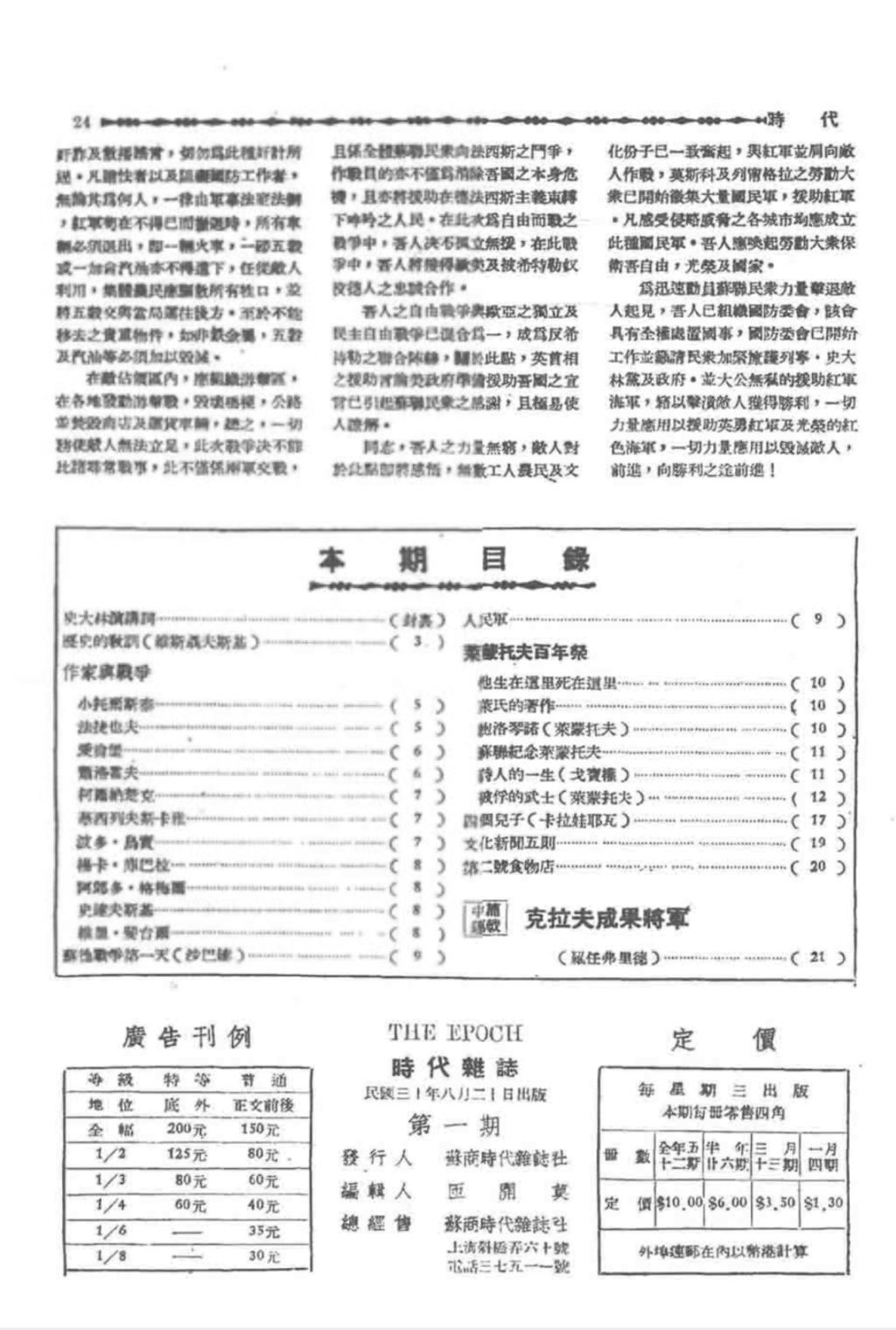 双方研究决定,由罗果夫提供材料,把俄文《时代》杂志上的一部分比较好的文章交给中方,另外塔斯社有些电讯让中方选用。《时代》杂志的编法与众不同。第一,横排,那时社会上还没有横排的杂志;第二,目录放在最后一页,这是苏联人的传统,国内书刊一般目录是放在前面的。这在形式上一新耳目。另外,杂志还会介绍苏联共产党,提到列宁、斯大林的名字,用他们的相片,有时要用镰刀斧子、五角星作题花,这也是所有上海的刊物不曾有过的。