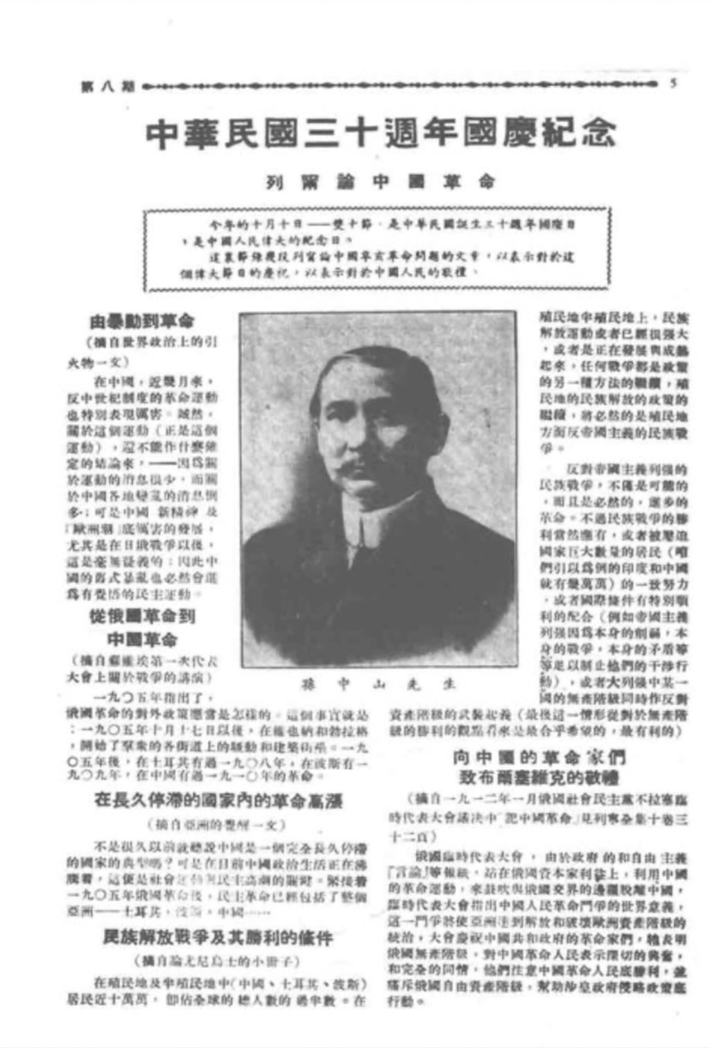 1941年10月10日,中华民国成立三十周年,《时代》杂志中文版特辟专栏,刊登了孙中山遗像,发表了“列宁论中国革命”的一组文章摘要,特别突出关于“民族解放战争及胜利的条件”,“反对帝国主义列强的民族战争,不仅是可能的,而且是必然的进步的革命”等内容。还摘编了列宁“向中国的革命家们致布尔什维克的敬礼”的指示,给处在黑暗中进行艰苦抗战的上海人民以巨大鼓舞。在苏联“十月革命”二十四周年纪念时,《时代》杂志中文版发表了郭沫若从重庆,柳亚子、茅盾、邹韬奋等知名人士从香港发来的贺电,表达了中苏人民团结一致,“全世界反法西斯侵略的斗争”必将胜利结束的美好愿望。《时代》杂志中文版还发表了大量介绍和评述苏联人民在敌后开展游击战争的情况,强调了游击队在反法西斯斗争中的战略意义。刊物在日伪封锁消息、实行血腥统治的上海以及整个东南沦陷区,将真实情况报道给了中国民众。