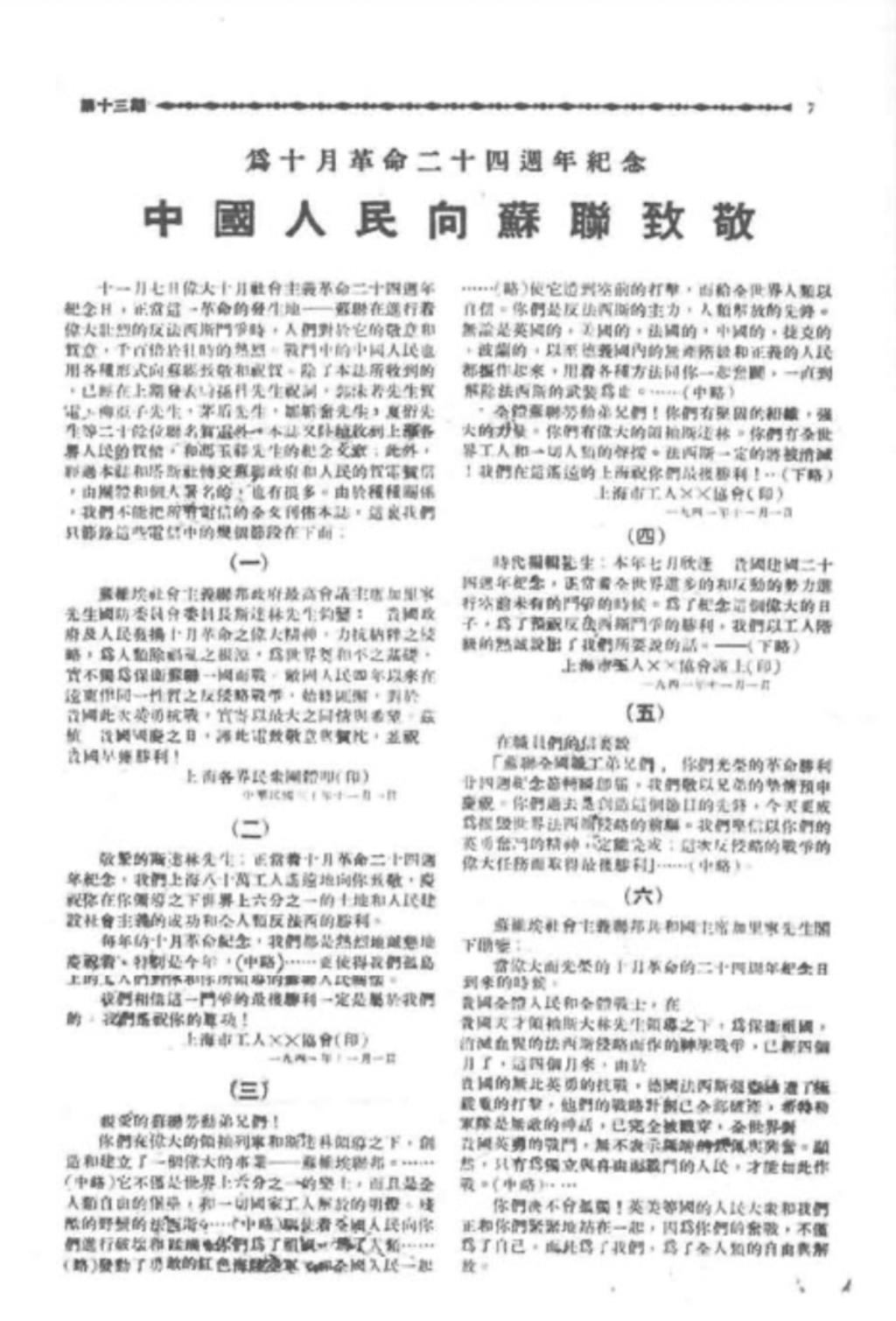 《为“十月革命”二十四周年纪念中国人民向苏联致敬》