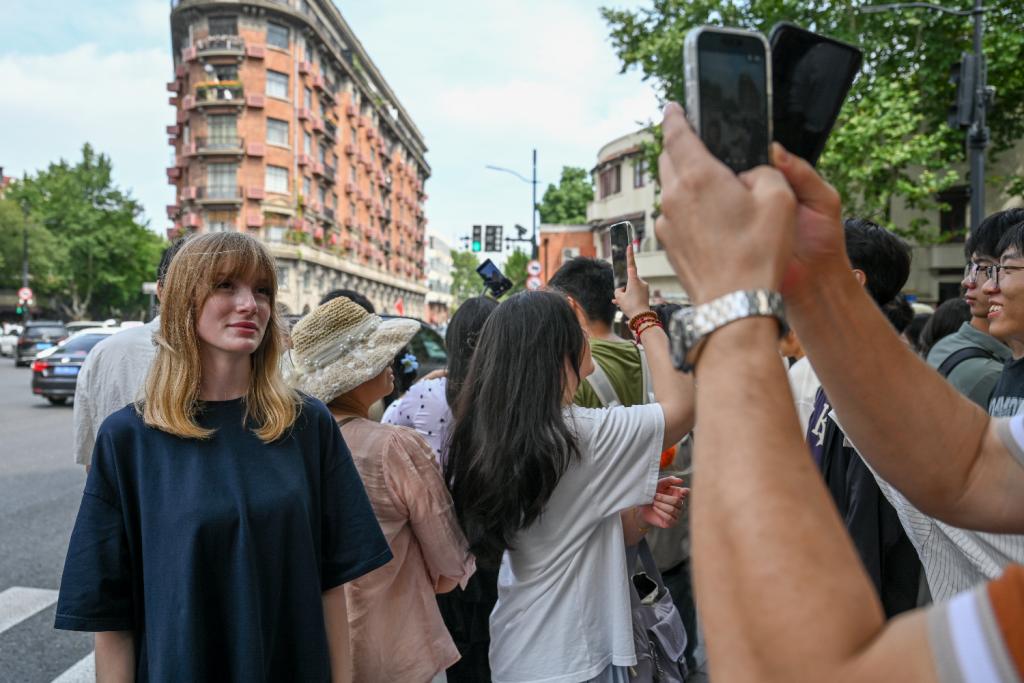 游客站在淮海中路上和武康大楼合影。澎湃新闻记者 朱伟辉 图