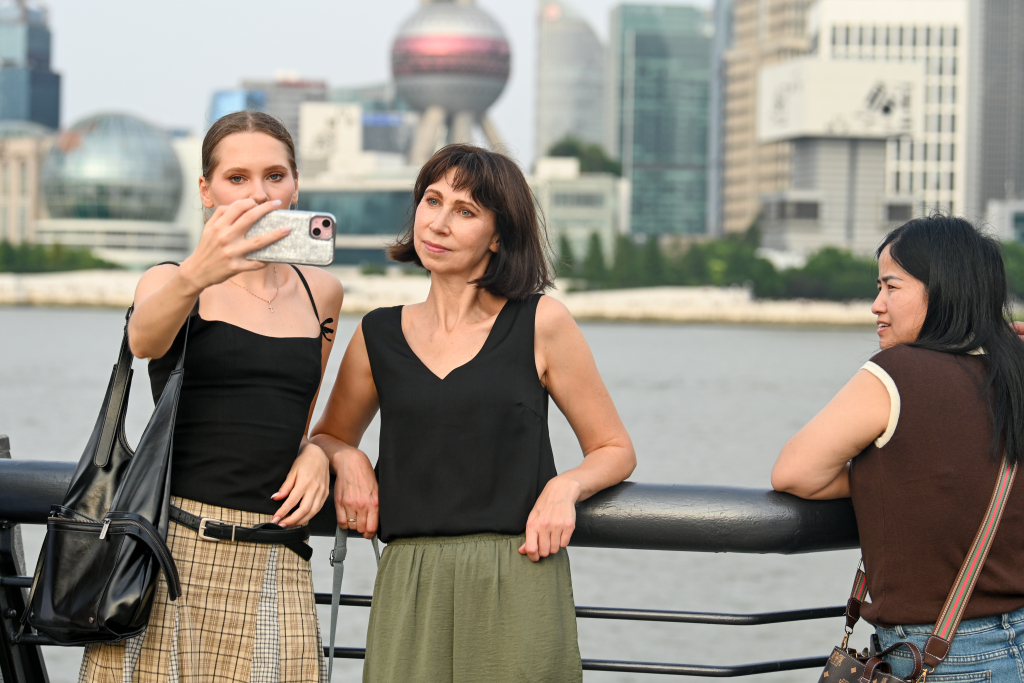 两位外国游客和东方明珠自拍。澎湃新闻记者 朱伟辉 图