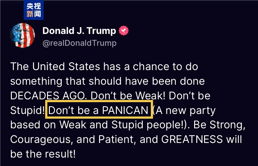 “不能做‘PANICAN’!”特朗普自创了这个由“恐慌”与“共和党”组成的混成词,解释为“由软弱愚蠢者组成的新政党”,并发布在社交媒体上。分析称,这显然在攻击反对关税的共和党“自己人”。