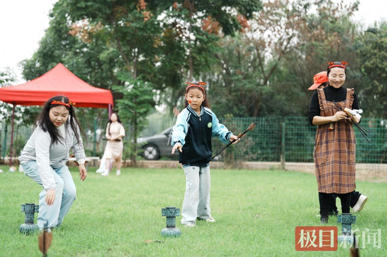 章华台基址展示馆外绿草如茵,古风运动会正在进行,投壶、射箭等传统项目,游客们摩拳擦掌、凝神瞄准、奋力投掷,现场欢呼声不断,亲子协作、好友比拼,在欢声笑语中体验古人运动乐趣。