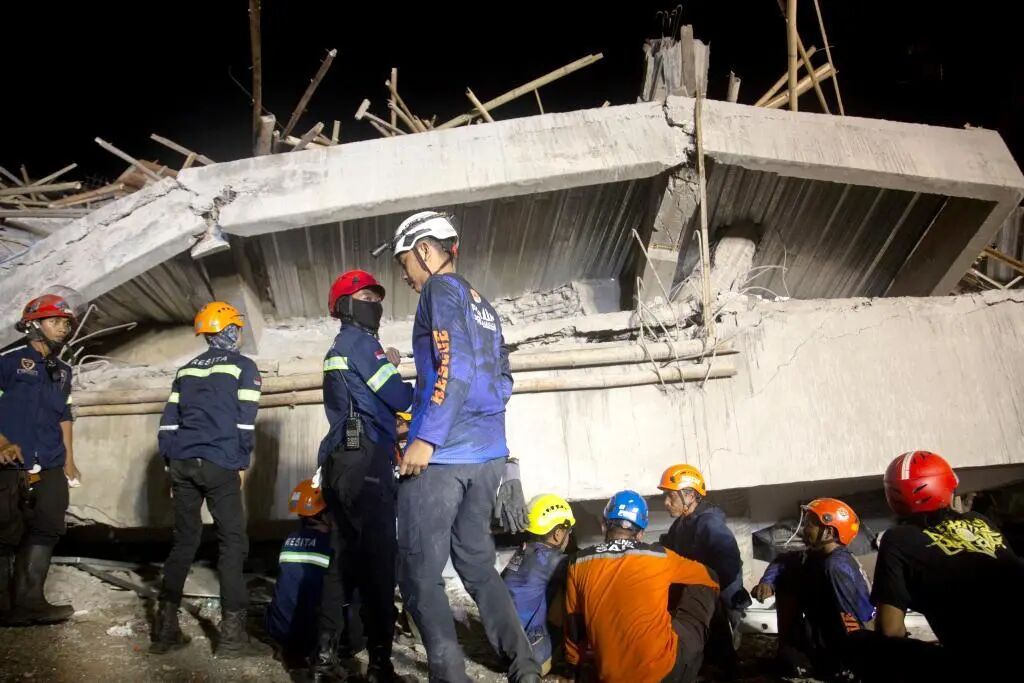 9月30日凌晨,救援人员在印度尼西亚东爪哇省诗都阿佐县建筑倒塌现场进行救援。新华社发(萨赫兰摄)