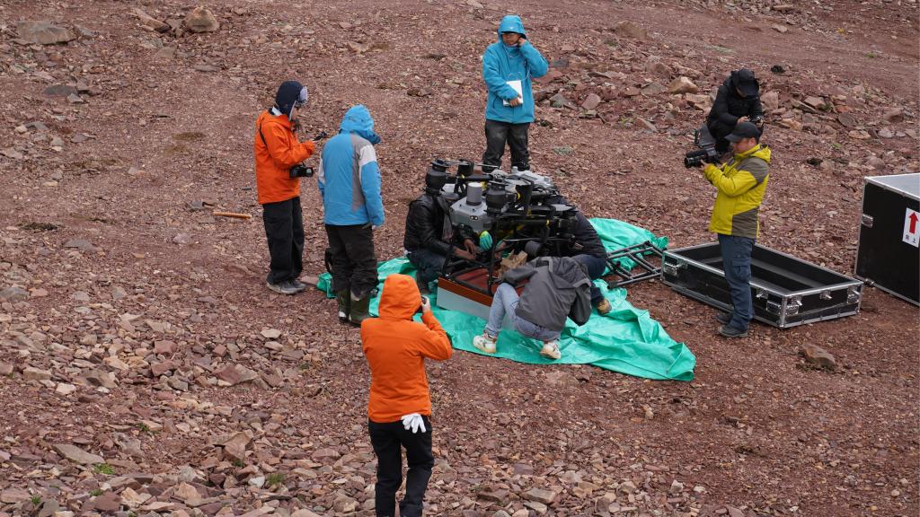 这是进行无人机测量的最佳窗口期。科考队员和技术队员立马行动,准备试飞无人机,进行扫描监测。随着一声“呜呜呜呜”螺旋桨盘旋起飞,科考队员悬着的心放松了。来自大连中睿科技发展有限公司的技术人员刘博,正操作着这架搭载探地雷达的大型无人机,对冰川进行测厚作业。